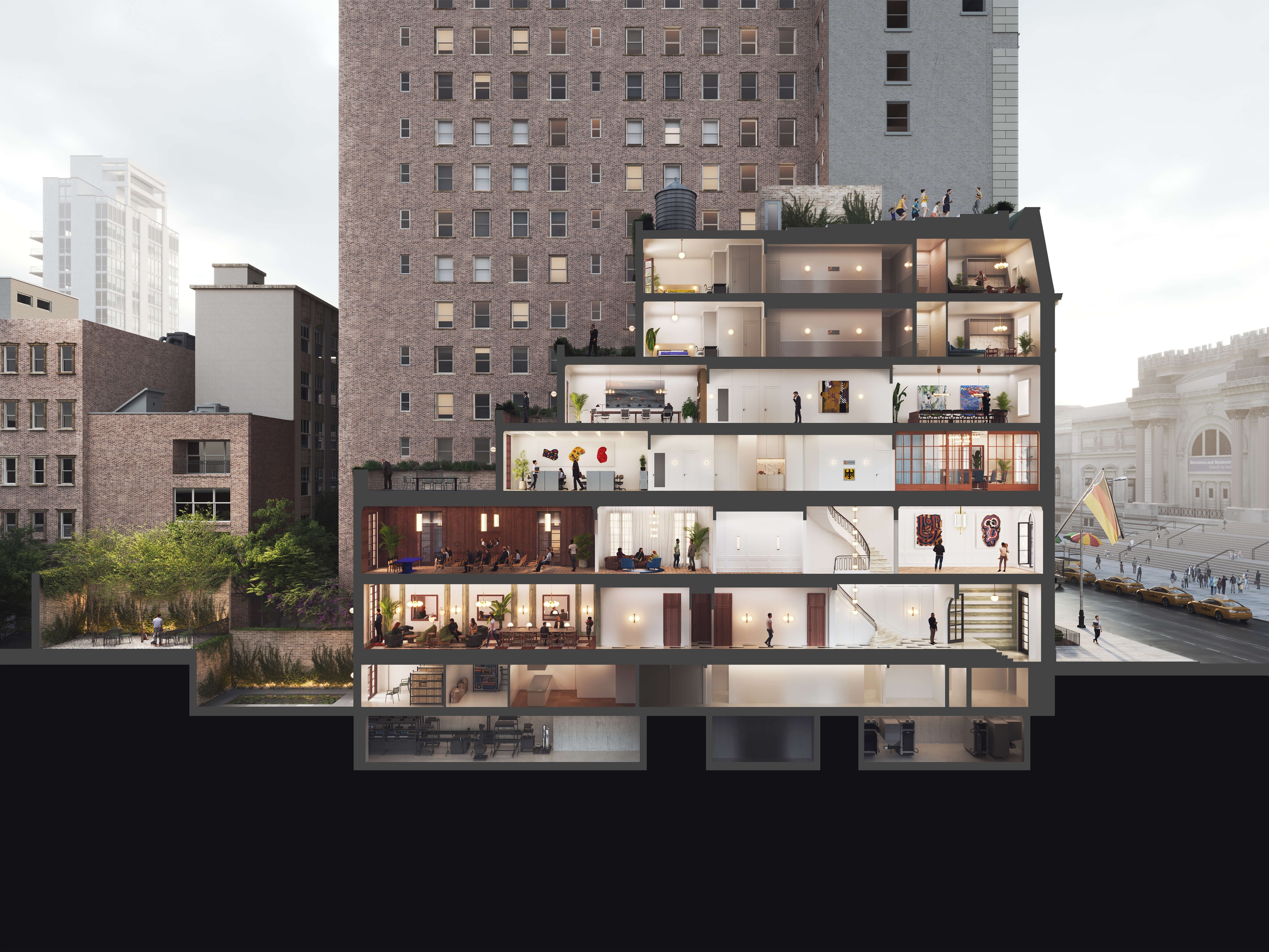CIVILIAN was among 10 international architecture firms asked to provide design proposals for 1014 Inc. - a new cultural institute and residency sponsored by the German Government in a townhouse on 5th Avenue. The program included public event, gallery and exhibition spaces; private staff offices; apartments and amenity spaces for a residency program. Working with Stonehill & Taylor Architects and a full cadre of specialized consultsants, the team proposed a user-experience focused renovation that made the most of the remarkable attributes of the building, integrated greenspaces into all program types and specific references to German design and art from the early 20th century to the present day.
