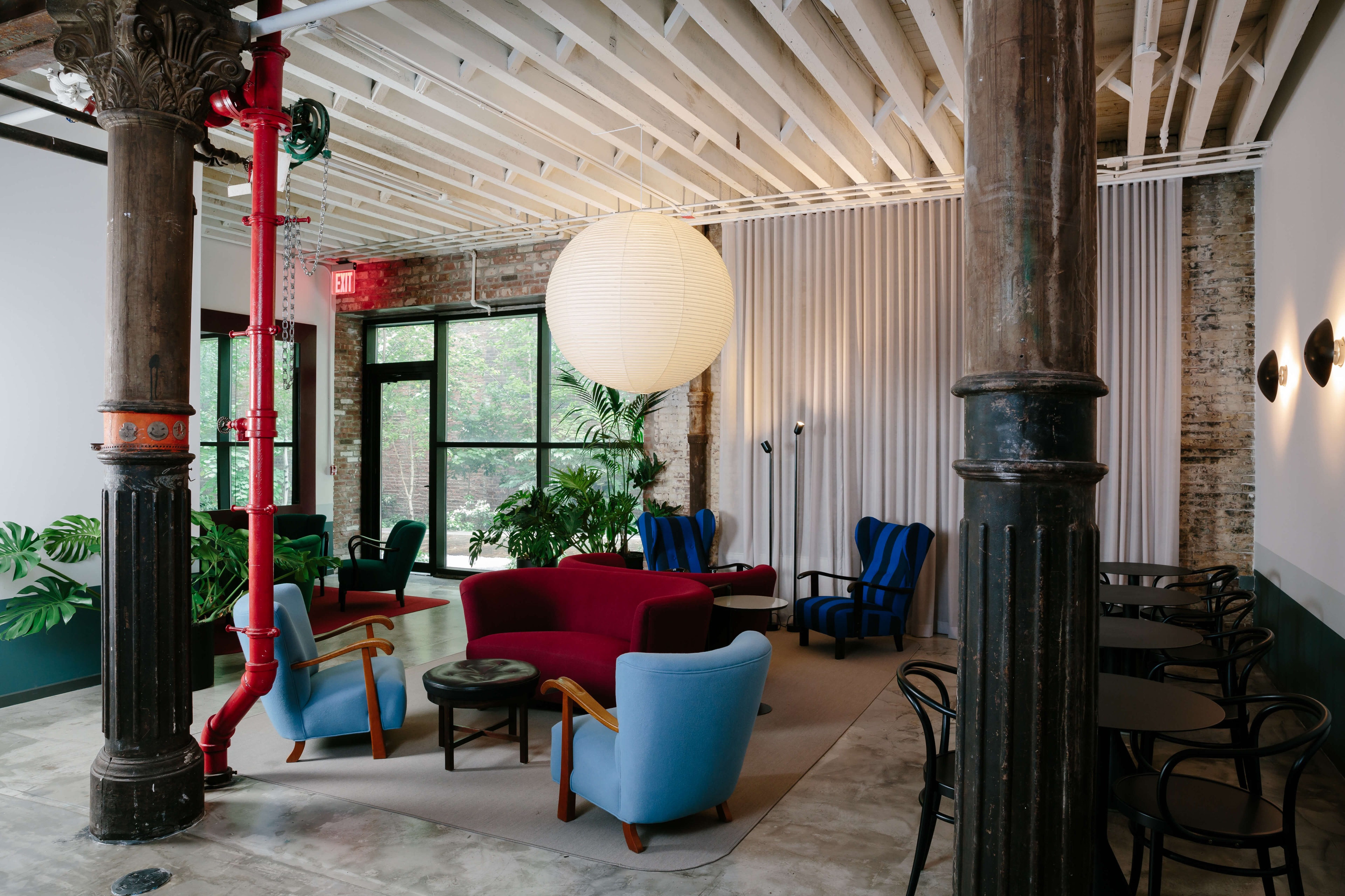 The design at the ground level creates an environment where members can socialize and collaborate in an unstructured way. Large windows screened by floor-to-ceiling window coverings soften the boundaries between the interior and the outdoors areas, while the plan emphasizes the transitions between the lobby, lounge, and conference area, resulting in a procession of distinct areas that remain interconnected with one another. A custom-designed reception desk made of aluminum laminate mounted on painted plywood tubes offers a contemporary element set against the buildings original details.
